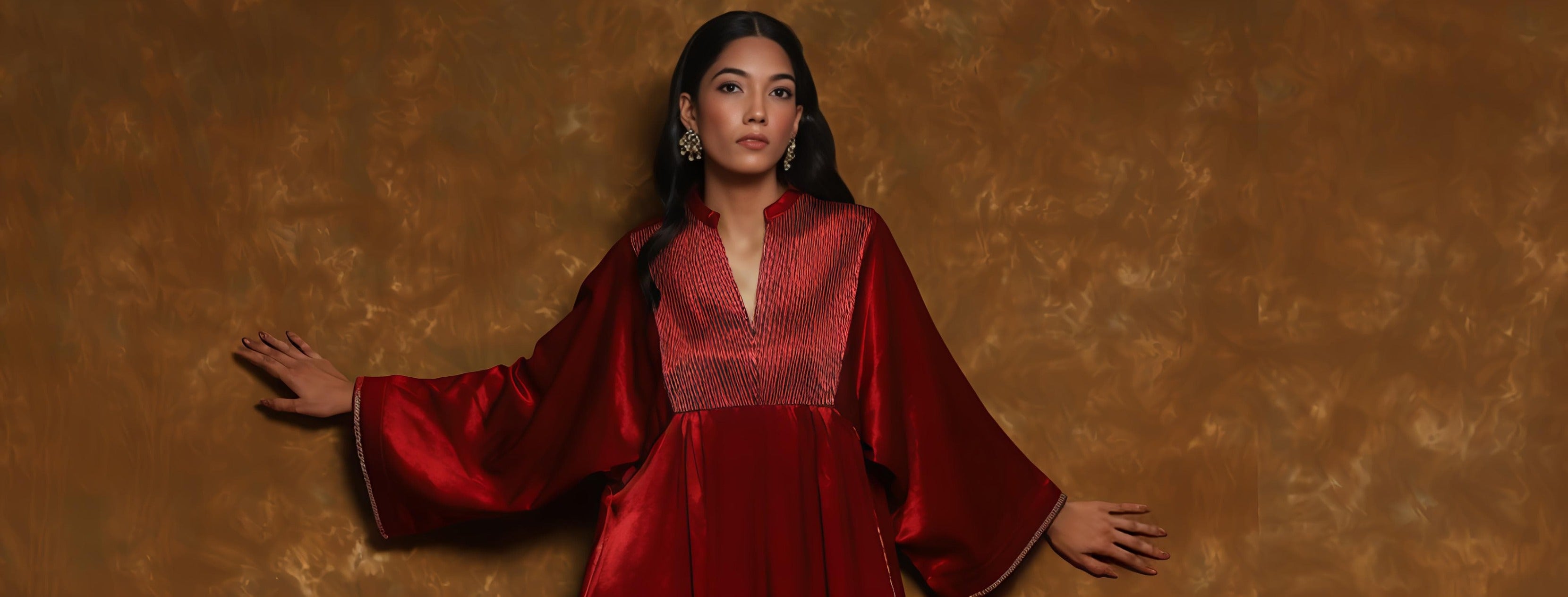 Mustard Red Floral Hand Block Printed Mulmul Night Suit with Bronze Trimmings