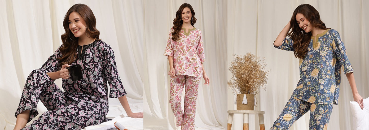 Multicoloured Hand Block Floral Printed Cotton Night Suit
