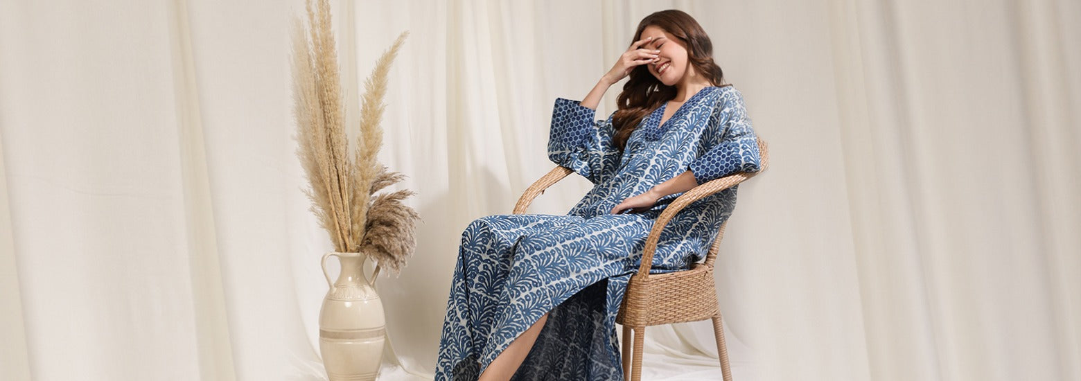 Blue White Floral Hand Block Printed Cotton Night Suit